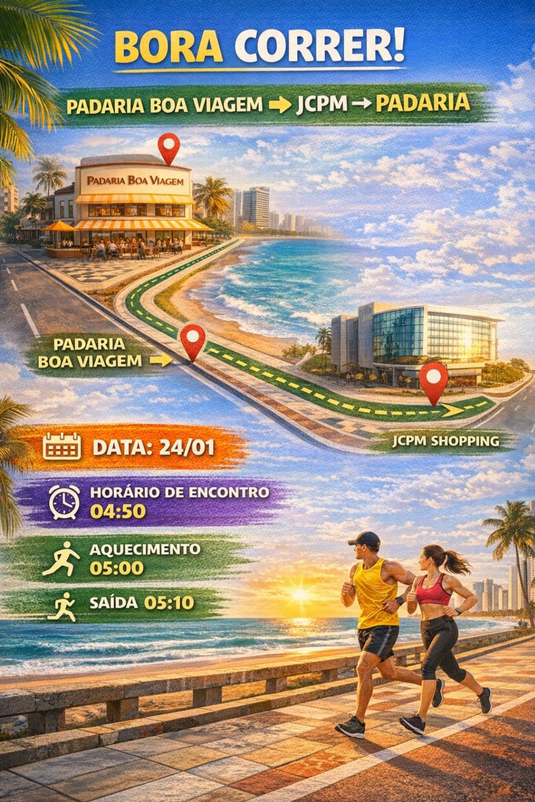 Treino coletivo *Corre On* saindo da _Padaria Boa Viagem, indo até o JCPM e retornando ao ponto inicial_. ? Encontro: *04h50* ? Aquecimento: *05h00* ???? Saída: *05h10*